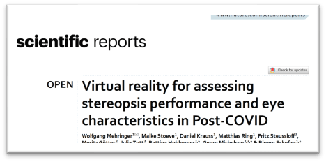 1 Mehringer W, Stoeve M, Krauss D, Ring M, Steussloff F, Güttes M, Zott J, Hohberger B, Michelson G, Eskofier B. Virtual reality for assessing stereopsis performance and eye characteristics in Post-COVID. Sci Rep. 2023 Aug 13;13(1):13167